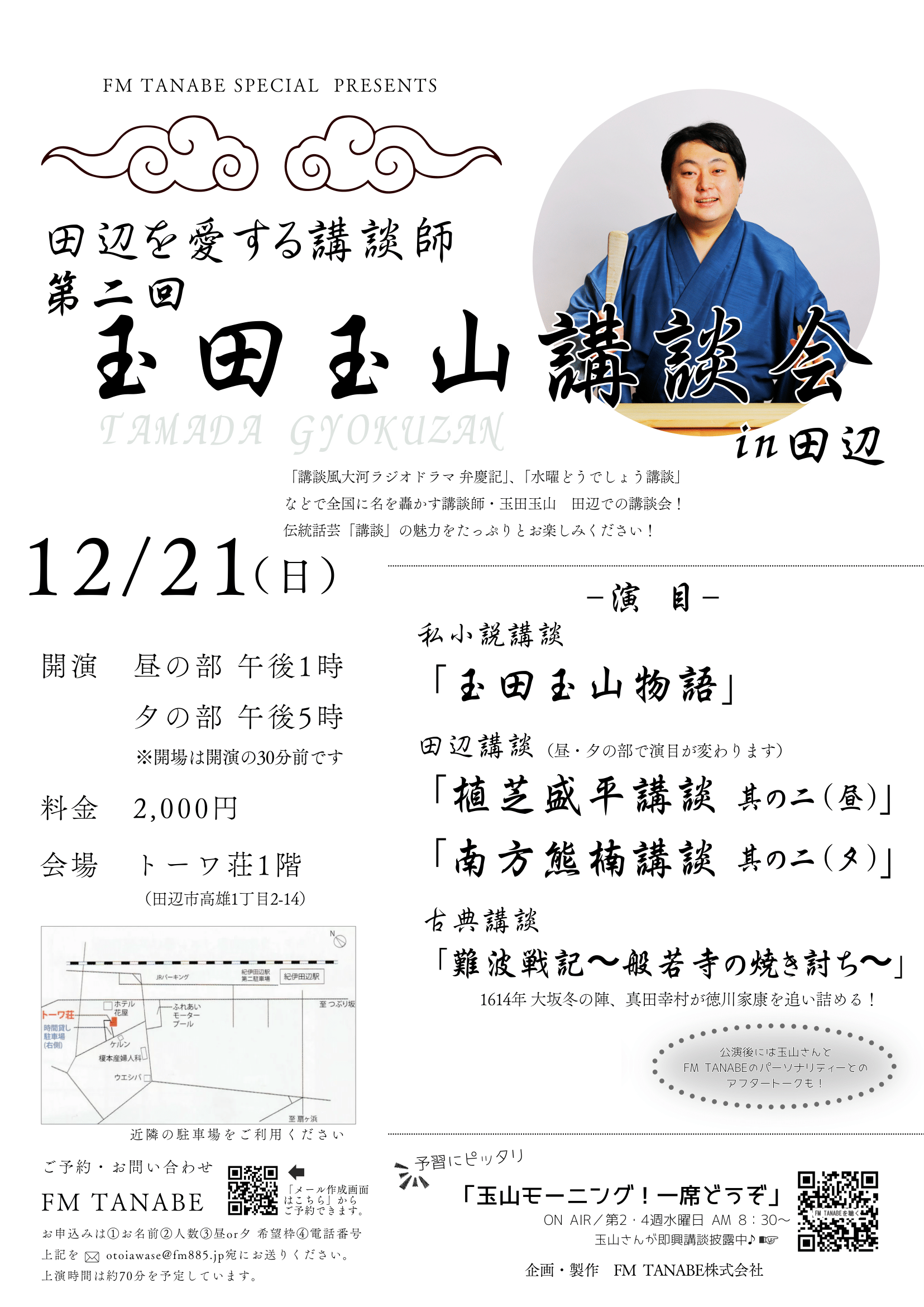 昨年12月には「弁慶記 吹奏楽プロジェクト演奏会」でも講談で演奏会を盛り上げてくださり、毎月第2・4水曜AM08:30から、「玉山モーニング!一席どうぞ」というコーナーでFM TANABEに定期的に出演されています。